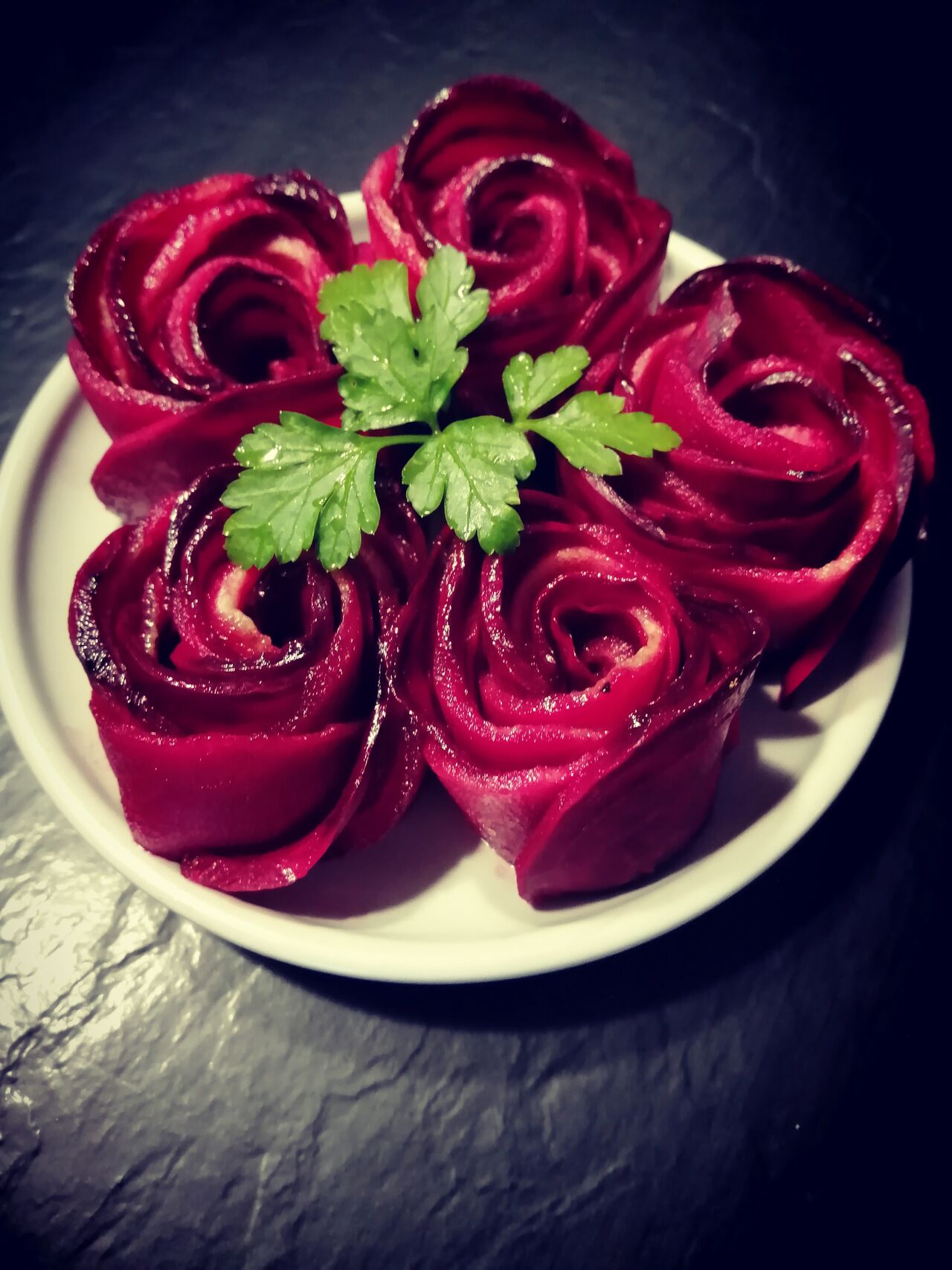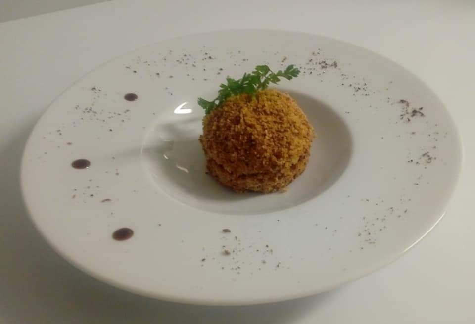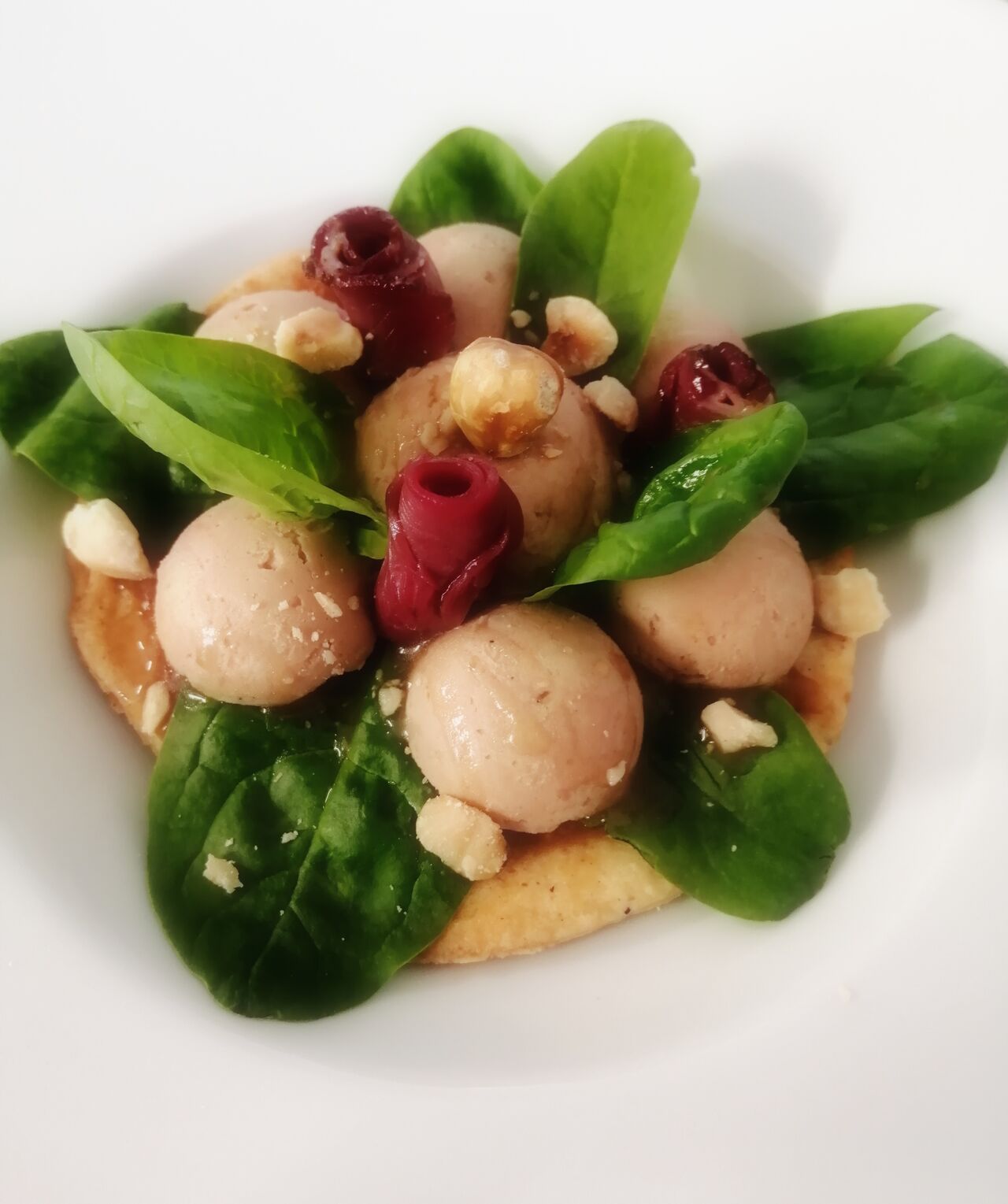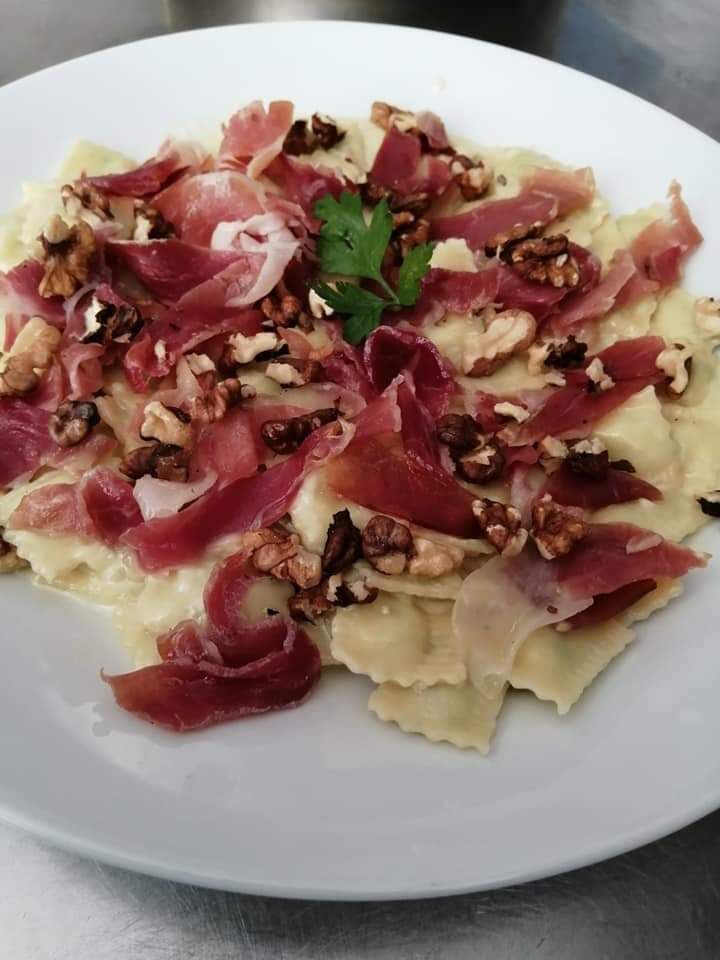 Ravioles sauce Saint Marcellin, pétales de jambon cru et noix concassées